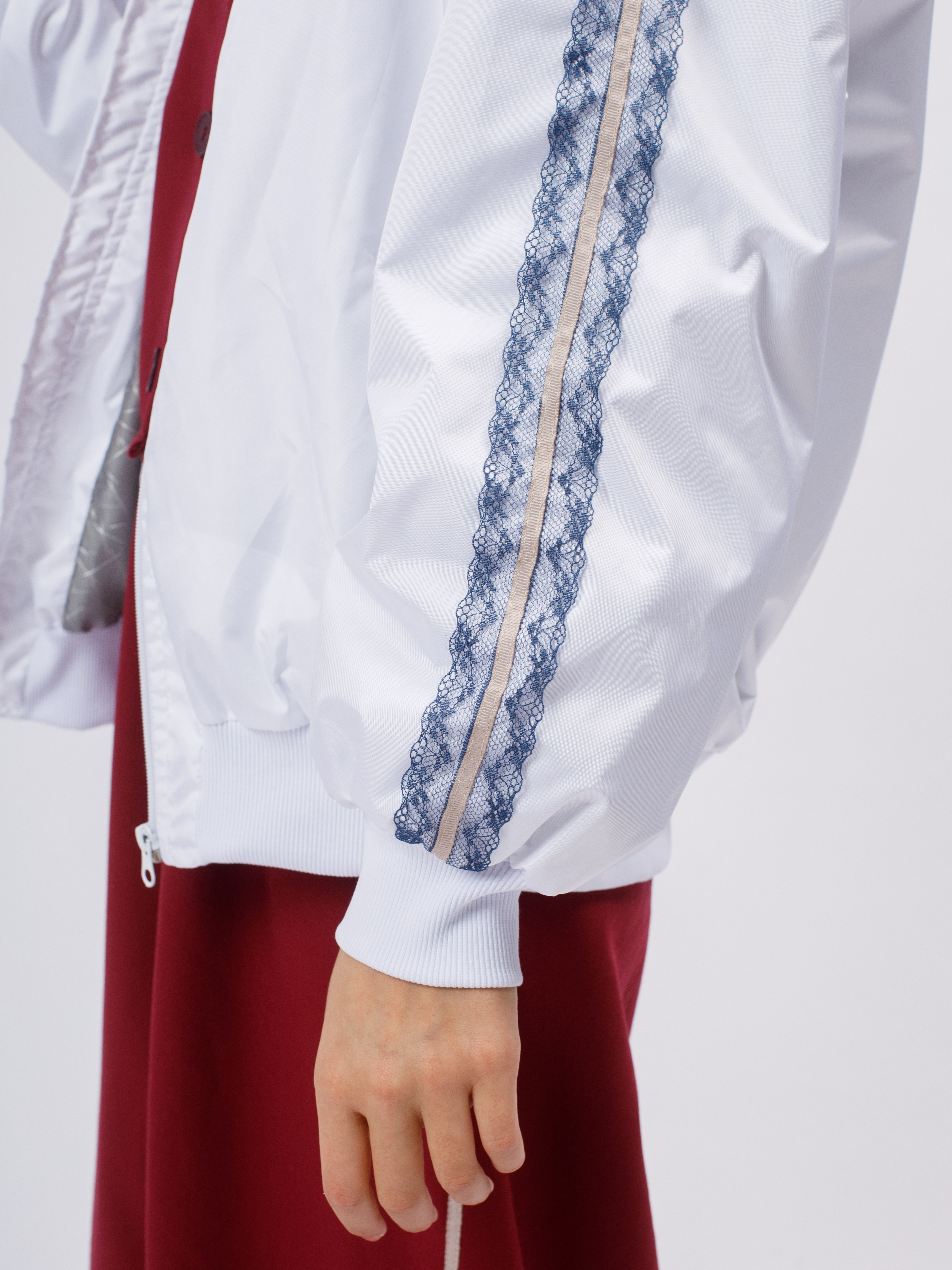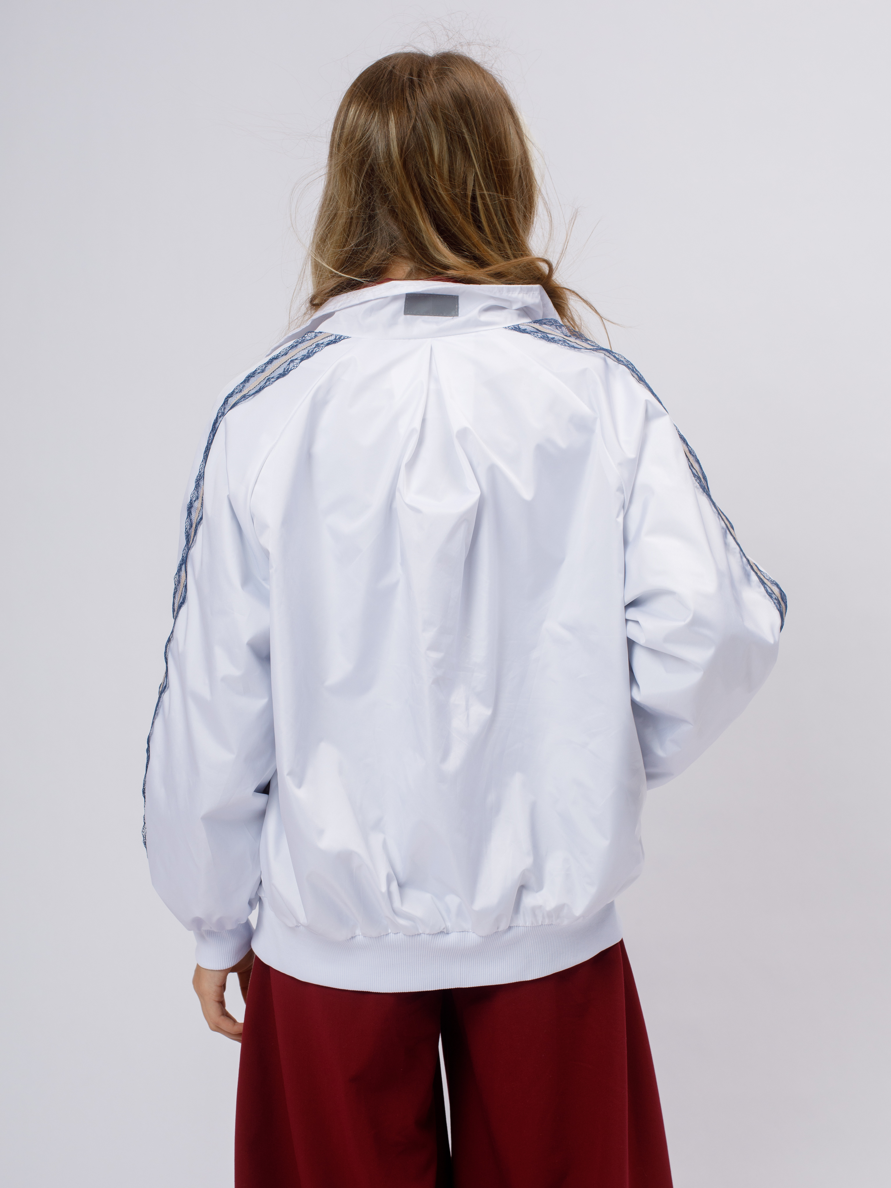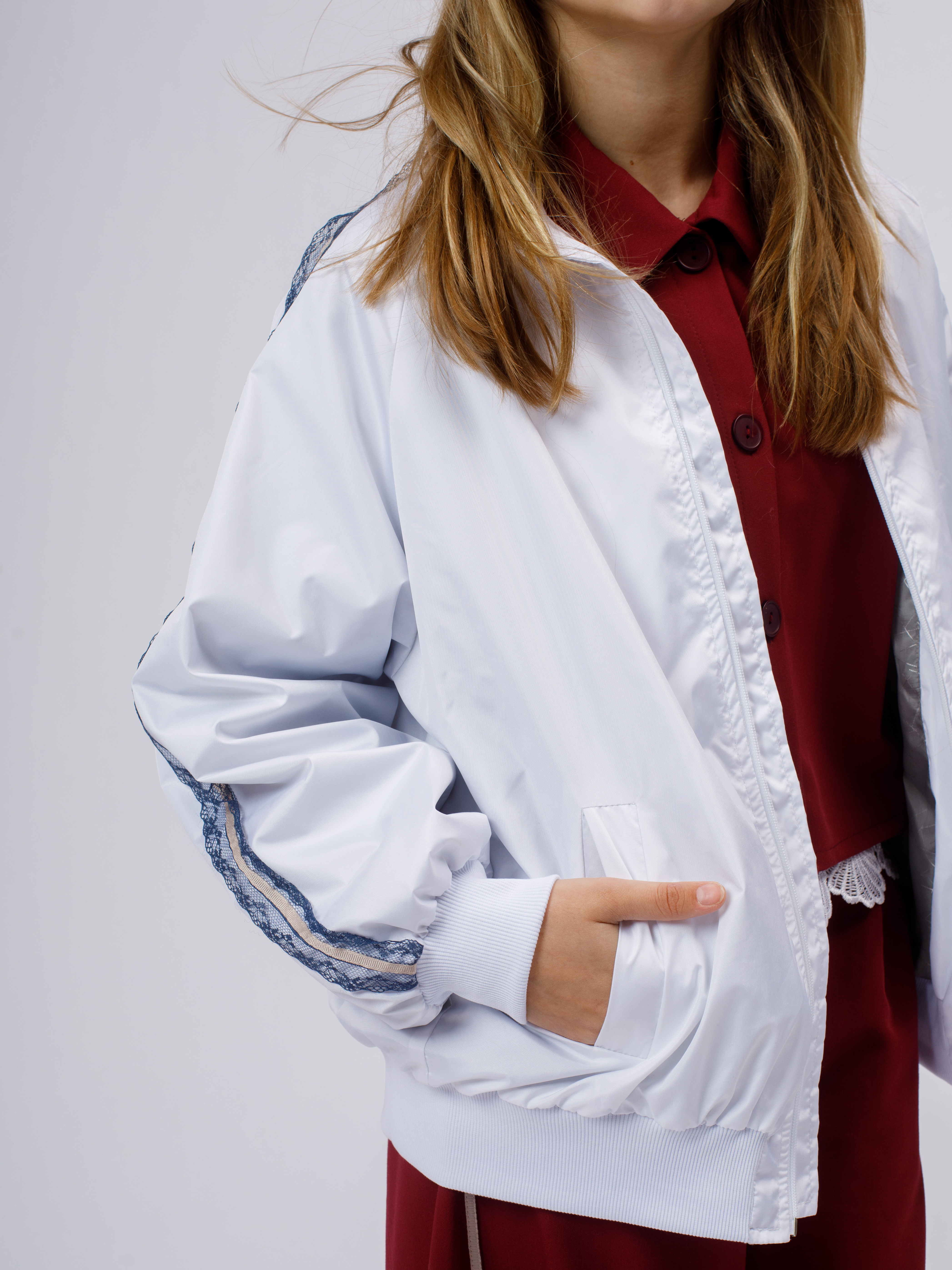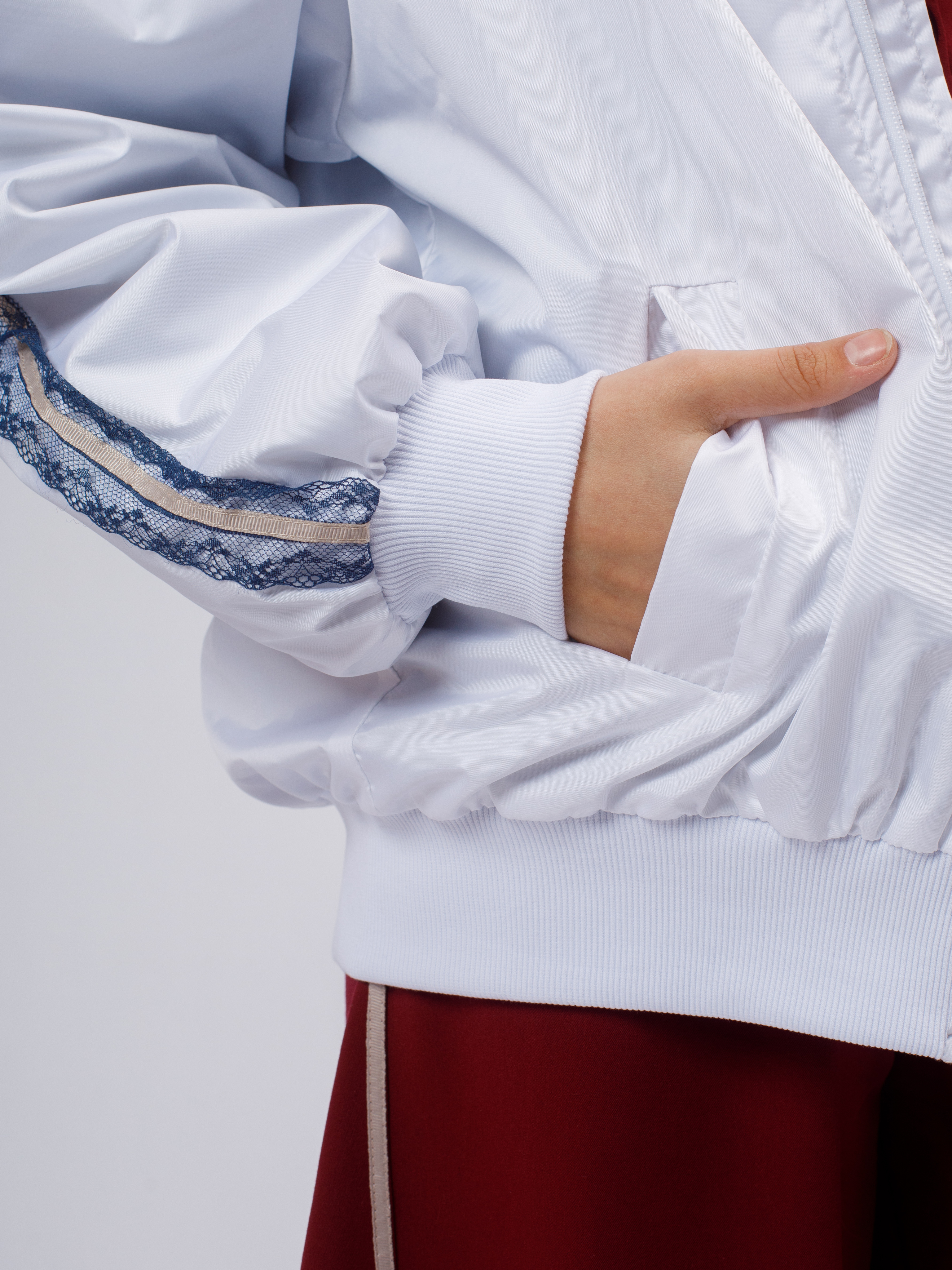 Стильная демисезонная ветровка без утеплителя в популярном корейском стиле. Модель сочетает в себе городской шик и функциональность благодаря нежному кружевному декору по рукавам (лампасы).